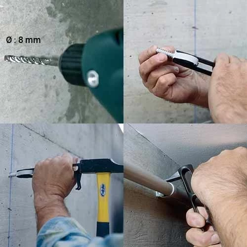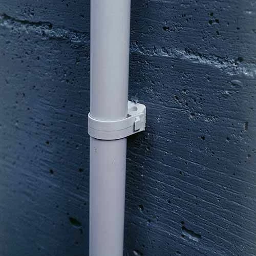 - Chaque fixation pour tube est démontable avec un tournevis et s’installe rapidement à l’aide d’une perceuse et/ou d’un marteau.